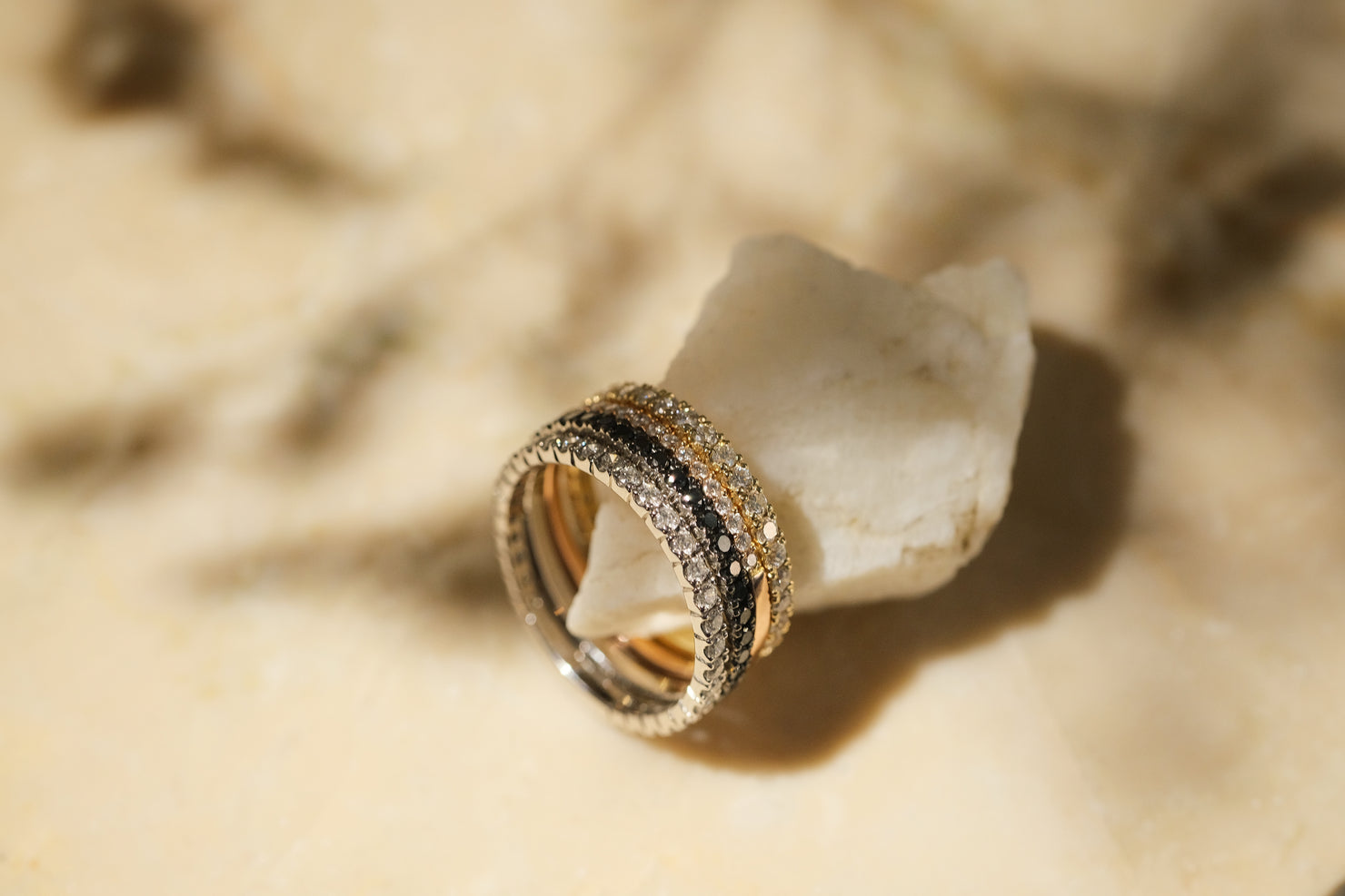 Begleitsteine: z. B. kleine weiße oder schwarze Diamanten im Ringband