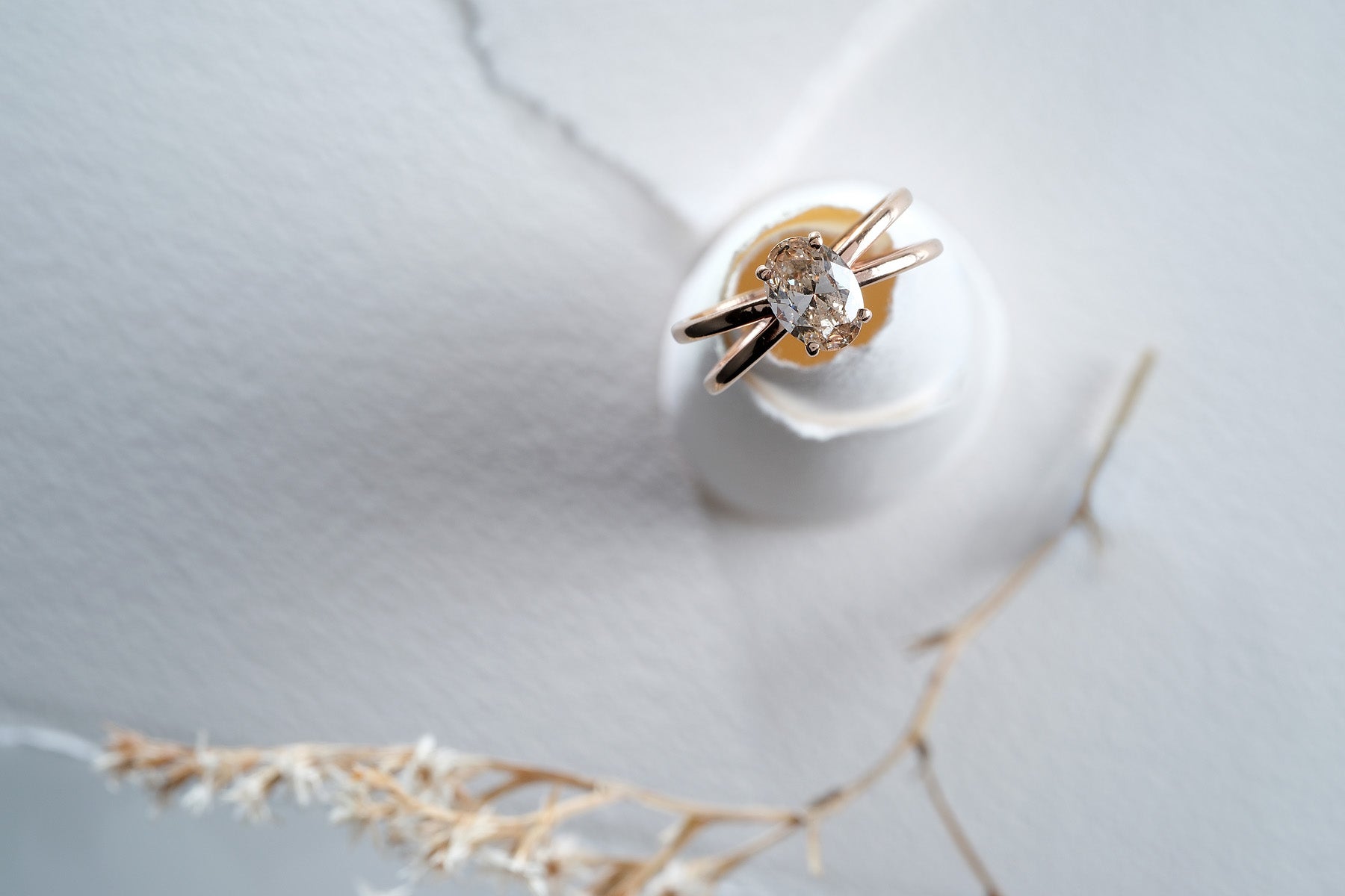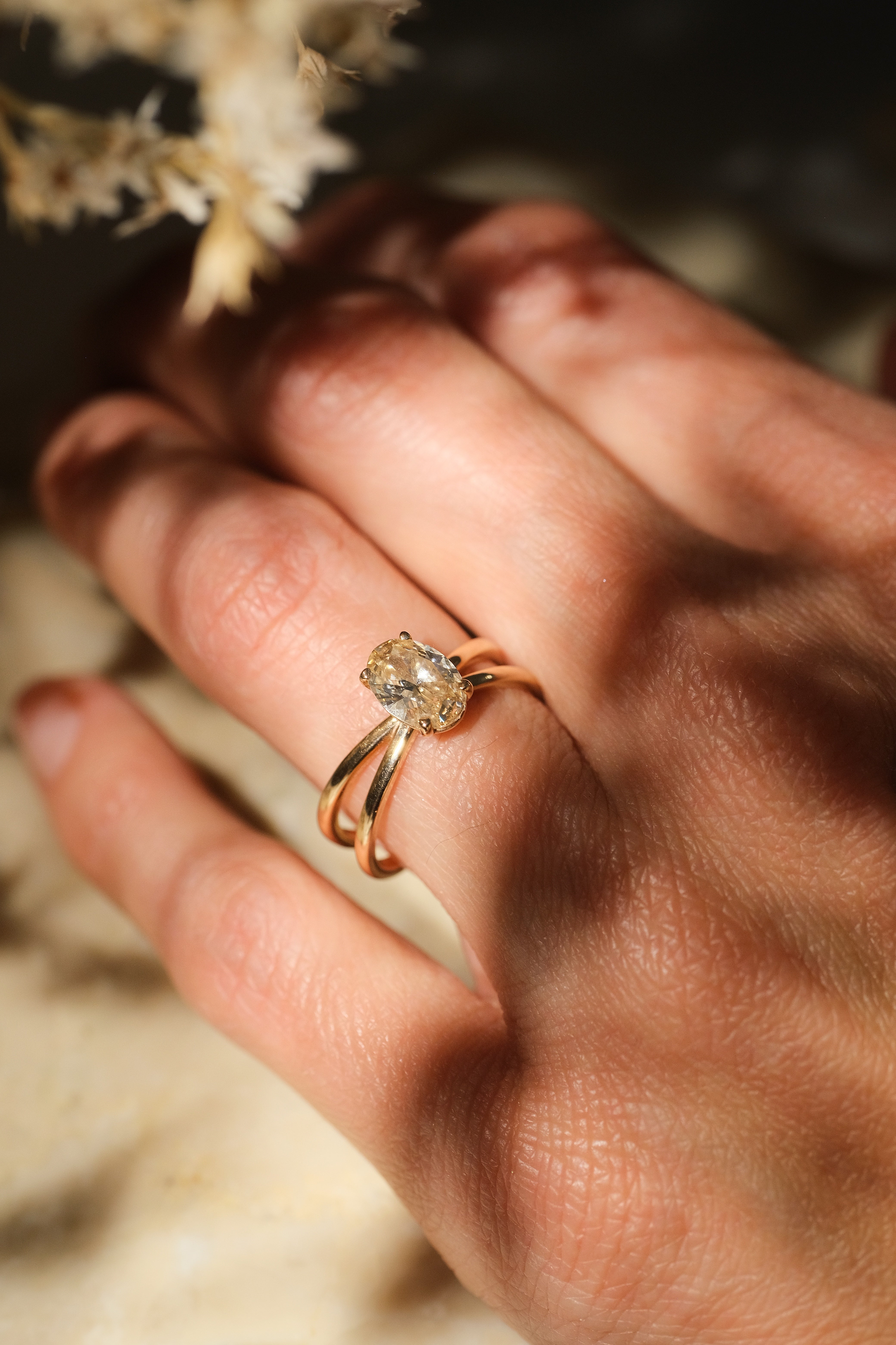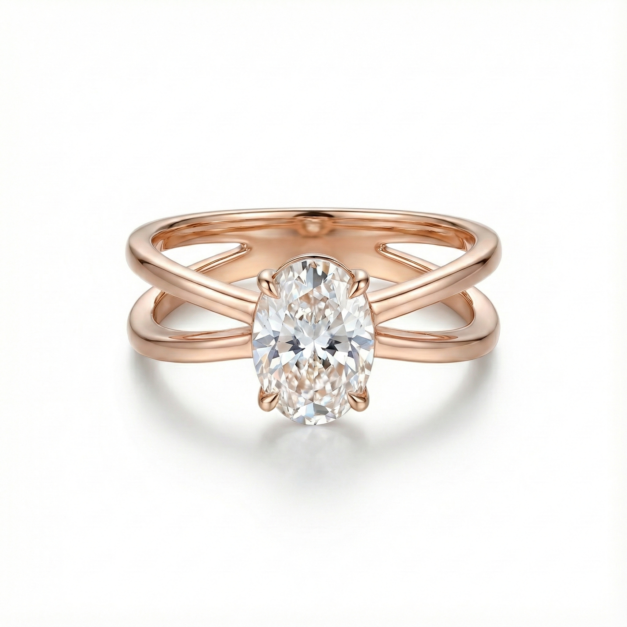 Erleben Sie moderne Romantik mit diesem atemberaubenden Unikat. Im Mittelpunkt steht ein brillanter, ovaler Diamant, der sicher in einer Vier-Krappen-Fassung sitzt – bekannt dafür, den Finger optisch zu verlängern. Das Highlight des Entwurfs ist die kunstvolle, geteilte Ringschiene (Split-Shank): Die Stränge aus Gold teilen sich sanft und verweben sich in einem überkreuzten „Infinity“-Motiv, das symbolisiert, wie zwei Lebenswege zu einem verschmelzen.