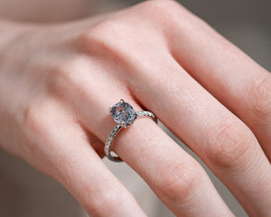 This exquisite ring showcases the captivating beauty of a rare gray oval sapphire – a gemstone celebrated for its understated elegance and mysterious depth. The cool, smoky hues of the sapphire are perfectly complemented by a delicate halo of white diamonds, carefully set into the slender ring band.