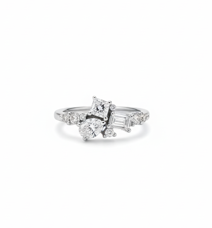 The Eclaté ring’s uniqueness lies in its elegant combination of diamond cuts. At its center shines a brilliant oval diamond, complemented by princess- and emerald-cut diamonds arranged in a cluster formation. Fine brilliant-cut stones complete the composition, adding even more radiance.