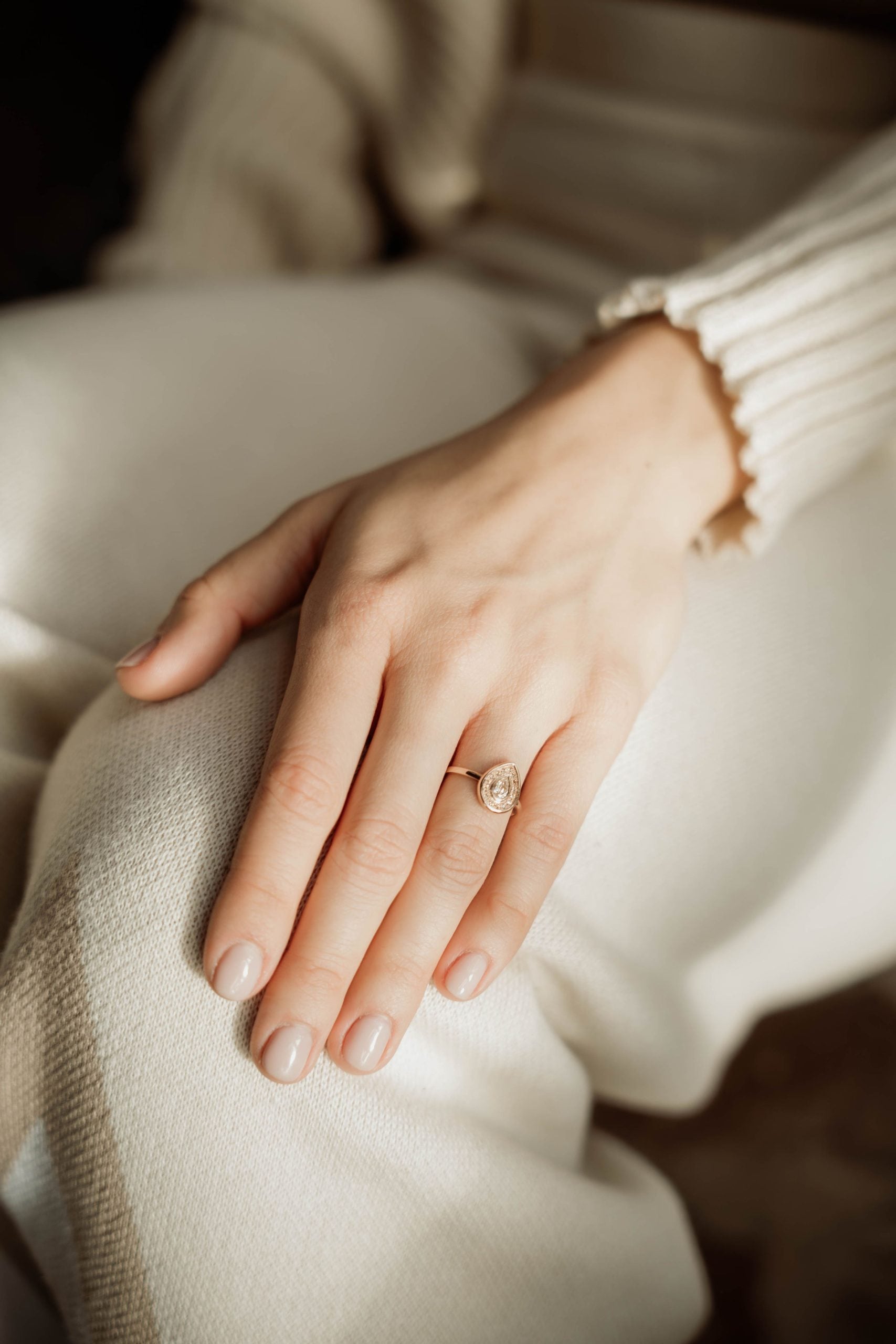 Der Mittelstein ist ein natürlicher, champagnerfarbener Diamant im Tropfenschliff (0,4 Karat). Er wird von natürlichen Diamanten im Brillantschliff umrahmt, wobei jeder Stein 0,01 Karat hat (Farbe G, Reinheit VS).