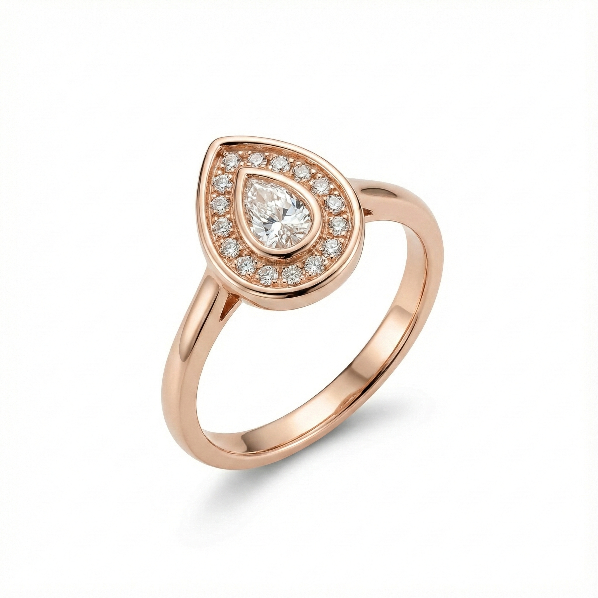 Dieser Ring aus Roségold ist der Inbegriff moderner Romantik. Der zentrale Edelstein im Tropfenschliff (Pear-Cut) wird von einem Halo-Rahmen aus strahlenden Brillanten umarmt. Diese Fassung sorgt nicht nur für ein unvergleichliches Funkeln, sondern vergrößert den Stein optisch auf eindrucksvolle Weise.